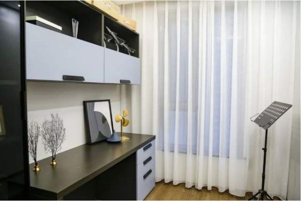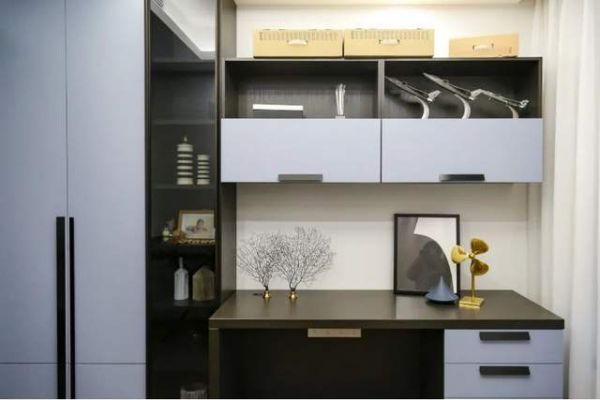 工作区:按照客户的需求,家里一定要存在一处能够独立办公、学习的地方。多个柜体的设置,能有效地收纳办公用品以及各种杂物;蓝灰色的色彩极具质感,在视觉上显得更加清爽明亮。
