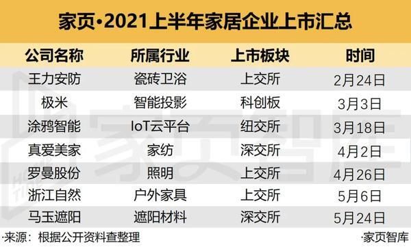在2021上半年,有7家家居企业挂牌上市,其中6家在国内,与极米和涂鸦这类科技公司不同,7家上市企业中王力安防、真爱美家、罗曼股份、浙江自然和马玉遮阳,5家都属于传统类目。