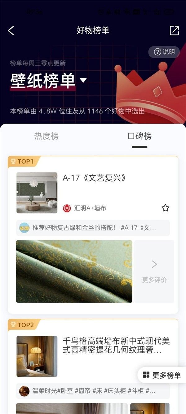 2021年7月份,在好好住联合各大家居生活产品品牌的新品速递活动中,汇明A+墙布荣登品牌口碑榜第一名。本次榜单由4.8万住友从1146个产品中选出,入选口碑榜第一是品牌实力的体现。