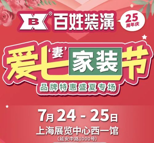 百姓“爱七‘妻’家装节”将于7月24日-25日在上海展览中心友谊会堂盛大举行,届时,百姓装潢将携手全球知名品牌建材,巅峰让利,并且重磅推出智慧装饰爱妻特权以及52777爱妻津贴,回馈新老客户多年陪伴。