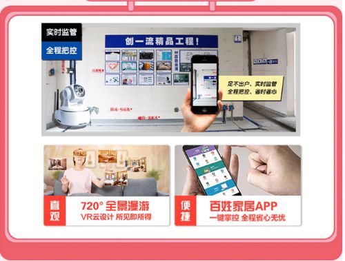 炎炎夏日,有了百姓智慧装饰,工地也不要跑啦,在手机上就能轻松操作。720°全景漫游,VR云设计,所见即所得,浸入式体验新家;百姓家居APP,从量房、设计、施工、售后等等环节一键掌控,享受全程无忧的家装服务;工地直播,随时随地检阅工地质量;项目专员“管家式”服务,完美交付。