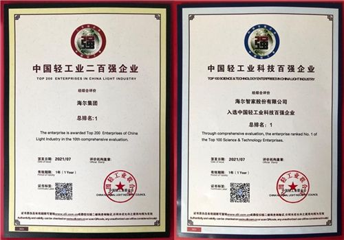 海尔此次同时获得“中国轻工业二百强企业”及“中国轻工业科技百强企业”榜单第一,是中国轻工业联合会进行评选以来的首次,证明了其优秀的市场表现与突出的创新能力。