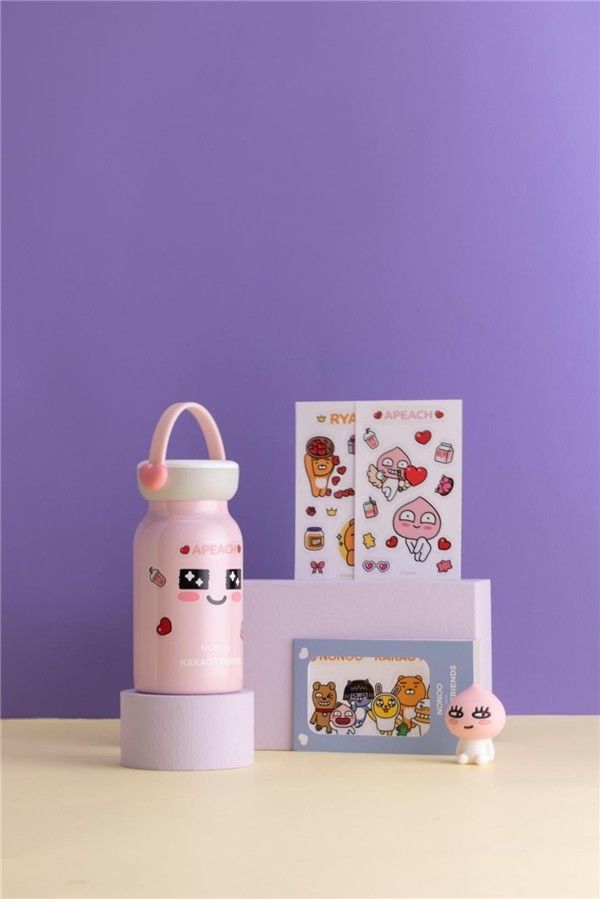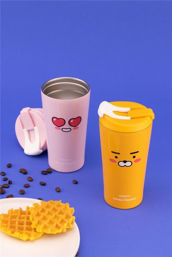 秋冬保温系列中,除了有镭射印花的咖啡杯,风格更偏酷炫,另外主打萌趣的三款产品,均随杯附赠三张KAKAO FRIENDS正版可爱贴纸,可以任意DIY,玩转创意,打造自己的专属水杯。