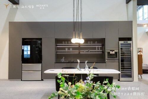 你可能好奇,为什么没有家电?因为家电成为了场景的一部分,与家装合而为一。比如在展区内的三翼鸟厨房场景中,橱柜的设计与冰箱融为一体,并预留了开门空间;三翼鸟阳台场景中,不同风格的收纳柜搭配不同款式的洗衣机、干衣机,上下水的管道也有明确的设计规划。