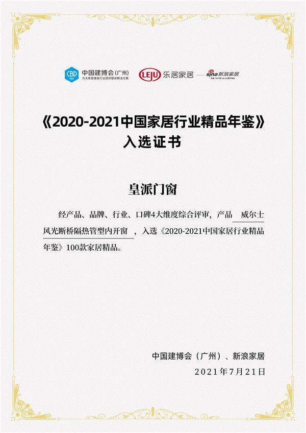 授牌认证!皇派门窗入选《2020-2021中国家居行业精品年鉴》100款家居精品