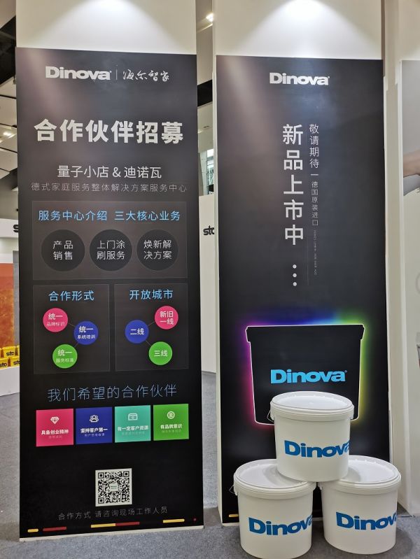 无独有偶,作为海尔的战略合作,迪诺瓦Dinova的涂料产品也于青岛首家海尔智家社区服务小店亮相。海尔智家是海尔集团旗下最大战略业务集团,以“1+N”智慧家庭场景解决方案的转型升级与落地,致力于为用户提供“设计一个家、建设一个家、服务一个家”的全流程解决方案。迪诺瓦Dinova进口乳胶漆、各种墙面处理产品和德国品质环保高标准吸引了很多客户的驻足和青睐!