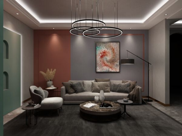 客厅部分同样延续意式极简风格,背景墙主题运用的颜色是:埃特纳火山灰与威尼斯红,威尼斯红是一种朴素温和的红色,被称之为威尼斯红是因为艺术家使用的颜料是从威尼斯托大区开采提炼出来的。同时展馆客厅搭配极简风格的软装配饰,运用简单线条与空间明暗形成完美搭配。
