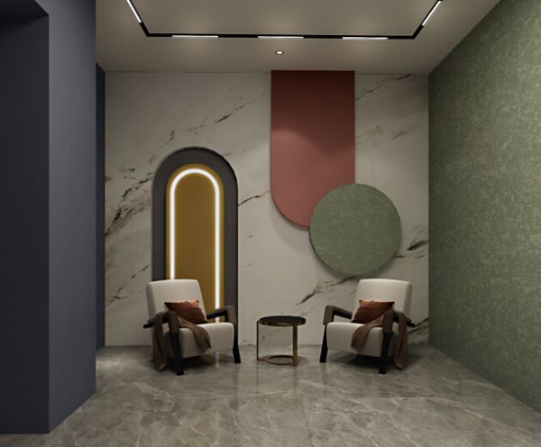 洽谈区大面积还是以火山灰色调为主,色卡墙采用深绿色,搭配圆形色卡造型,侧面墙采用那不勒斯黄与庞贝红贯穿搭配,中间白色墙面则象征的是阿尔卑斯山上的白雪,最后选择一副大卫雕像的装饰壁画作为点缀,同时搭配简约风格的壁柜与桌椅,来提升空间艺术感,增强实用性。