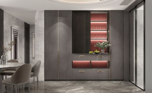 简·科罗的餐厅,以简驭繁,简洁利落的直线、藏秀相宜的布局营造空间的自由开放与极具包容性的美学感受;灰色仿木皮的饰面与现代感赫红色饰面背板形成视觉层次感,冷暖和谐的色调使整体空间的纵深感得以立体张扬。
