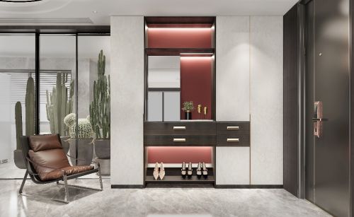 简·科罗的入户空间,层次分明,生机盎然。其中,入户玄关区空间狭长,通过鞋柜及收纳柜的位置调整,达到空间不拥挤,视觉不压抑。柜子的横向及竖向比例精准调配,给入户过道带来层次感十足的对比,赤魅红的点缀让空间氛围更显生机勃勃。