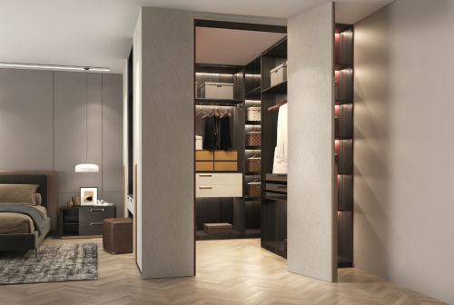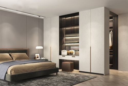简·科罗的卧室,优雅浪漫,至简至美。其中,雀羽枫门板,搭配上流苏编制皮革的护墙材质,简洁的高级感自然而生;沉稳低调的线条渲染出空间强烈的张力与极致的内敛。衣帽间形成相连一体的结构,右边为衣帽间进入区域,带最先进的折叠门技术,当门板收起时候形成一整体的平面,衣帽间隐藏其中,形成丰富的区域变化,无形扩容又形成整洁秩序感。