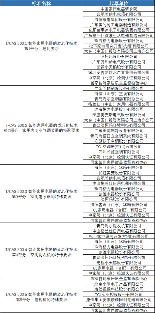 《智能家用电器的适老化技术》系列标准包含5项团体标准和4项公司技术规范,涵盖了 空调器、电冰箱、洗衣机、电视机、吸油烟机、净水机(饮水机)、马桶盖、热水器 8类产品,基本涵盖了老年人在日常生活中会使用到的所有家电类型。符合该系列标准的家用电器,经过中家院检测认证之后,将会获得智能适老家电认证。