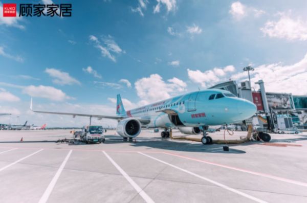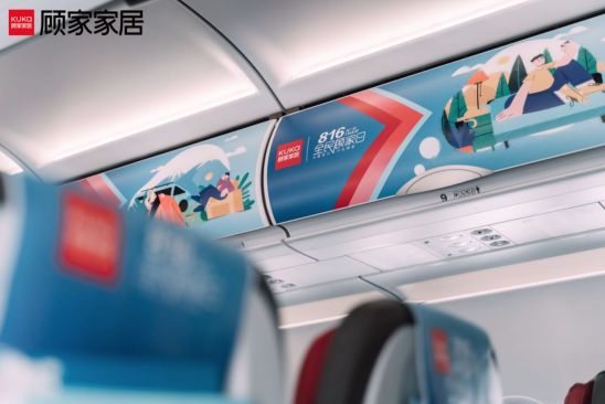 这一次,顾家不止布置了飞机舱的舱内,把头枕和行李柜都装饰上了主题视觉,更是把飞机的整个机身也贴上了“顾家向往号”的机衣,全方位响应营销主题,为816全民顾家日助力。