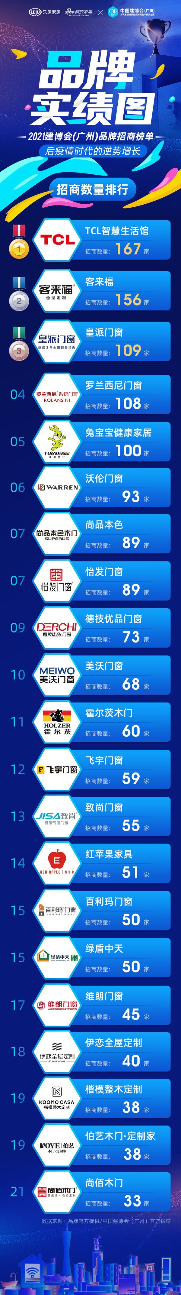 新浪家居作为特邀媒体参与全程报道,以逛展、短视频、论坛、图文等多重形式进行了全媒体平台报道。而作为疫情后的大型建材类盛会,2021 中国建博会(广州)的成功举办,也预示着行业逐步回暖,并呈现逆势增长趋势。各品牌在展会上的招商也非常乐观,根据各品牌向新浪家居提供的数据及建博会官方数据,新浪家居汇总了建博会上的部分品牌招商情况如下: