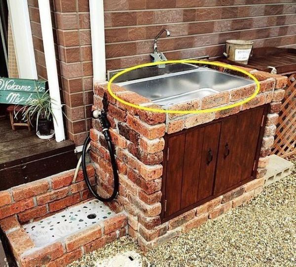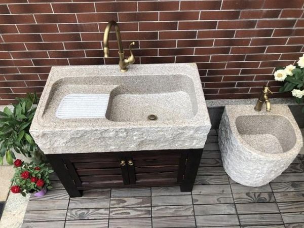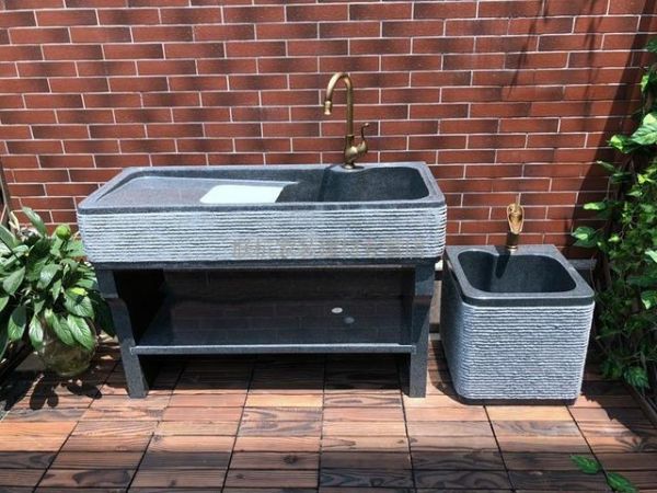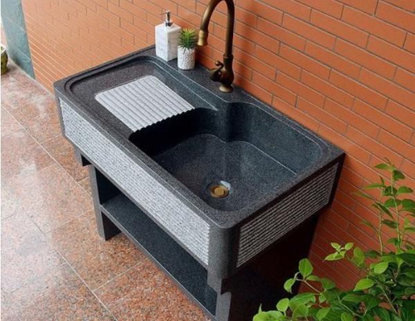 农村自建房的庭院中,可以安装延长式的水池,一边为水池,一边是搓衣板的台面,台面下方可以收纳农具或者水管,特别实用。