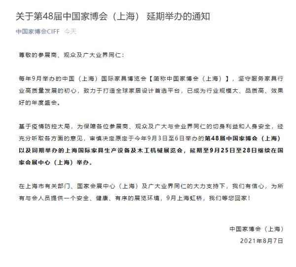 8月7日,据中国家博会官微消息,搜狐焦点家居获悉,由于近期国内多地再次出现新冠肺炎疫情新增本土病例,基于疫情防控大局,为保障参展商、观众及广大与会业界同仁的切身利益和人身安全,决定将原定于今年9月3日至6日举办的第48届中国家博会(上海)以及同期举办的上海国际家具生产设备及木工机械展览会,延期至9月25日至28日继续在国家会展中心(上海)举办。
