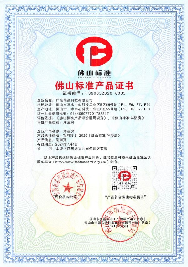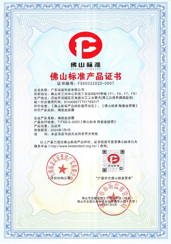 自2020年开始,佛山旨在打造一批高标准、高要求的制造业企业,并先后发布了关于佛山标准的准入机制和评选标准。在卫浴领域,尚高卫浴与多家佛山知名卫浴制造企业,凭借着优秀的产品品质,以及完善的售后服务,获得《佛山标准产品》证书。