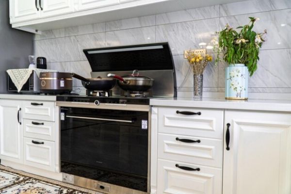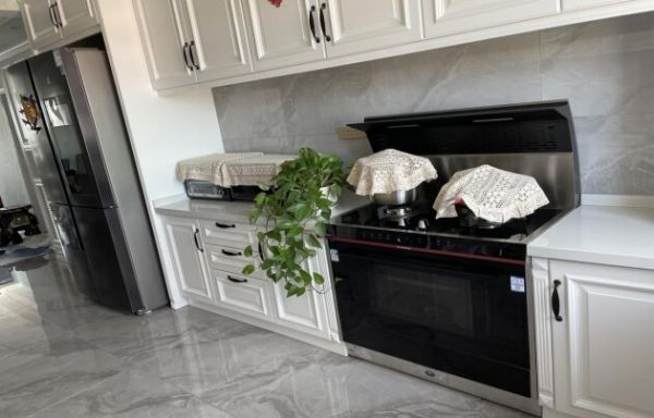 备餐区主要是日常的做饭、以及餐后的洗涤工作,潘女士选择了火星人这款x7的蒸箱款集成灶,不仅容量大,一次可以做好几道菜,而且吸油烟效果也特别好,无论是爆炒还是煎炸,屋子里一点油烟味都闻不到,这也是她敢于做白色橱柜和在厨房中放绿植原因。