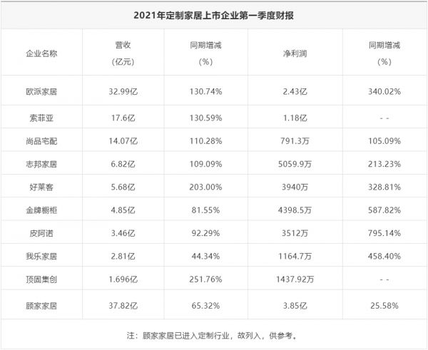 从一季度的数据来看,一季度全国规模以上建材家居卖场累计销售额为1980.6亿元,同比上涨111.92%,整体上已经恢复至疫情前的水平,整体景气度较好。去年一季度在疫情的影响下,定制家居企业财报数据普遍“大滑坡”。对比之下,今年定制家居行业十大上市公司一季度成绩亮眼,多家公司业绩大超市场预期,净利润相比上年同期实现翻倍增长。