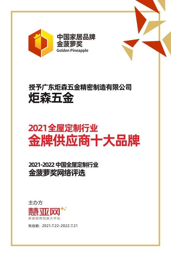 此次品牌盛典环节,慧亚网根据多项数据调查和品牌实力,角逐出全屋定制和门窗行业七大奖项的优秀品牌,在“向‘新’而生”2021第六届中国大定制家居营销发展论坛上重磅揭晓!其中,炬森五金凭借优秀的品牌综合实力脱颖而出,荣获“金牌供应商十大品牌”荣誉。