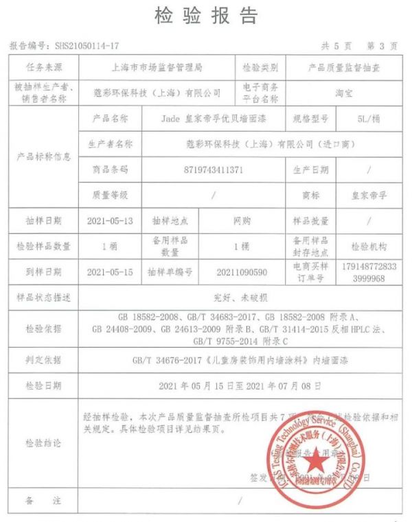 根据抽检结果显示,皇家帝孚优贝墙面漆符合国家推荐性GB/T 34676-2017《儿童房装饰用内墙涂料》标准,产品质量合格。