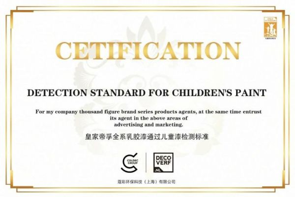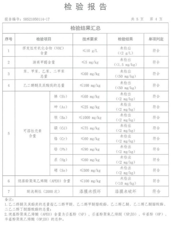 真金不怕火炼,百淬才能成钢,按照国家推荐性标准GB/T 34676-2017《儿童房装饰用内墙涂料》,经上海市场监管局授权的第三方检测机构,对产品的挥发性有机化合物(VOC),苯、甲苯、乙苯和二甲苯总和,游离甲醛,乙二醇醚及其酯类的总量,可溶性重金属(锑、砷、钡、镉、铬、铅、汞和硒)五个项目进行检测,皇家帝孚优贝墙面漆符合国家推荐性标准要求。