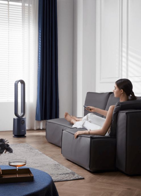 其工作原理是通过创新风道设计带动无叶风扇两侧气流,形成差动式喷射气流,加快空气的流动,使温润柔风均匀覆盖全屋。放在家中任意角落,享受四季凉暖的清新体验,而且55°大广角送风,加快室内空气循环,实现无死角送风。