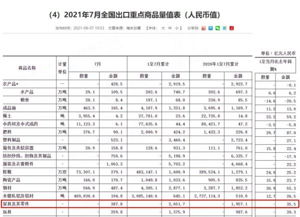 8月7日,据海关总署最新公布的数据显示,2021年7月,我国家具及其零件出口额为387.8亿元,1至7月出口总额为2651.7亿元,去年1至7月出口总额为1957.1亿元。今年1至7月出口总额比去年同期增长35.5%。
