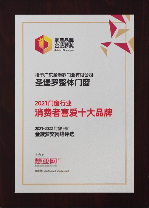 另外,为肯定优秀企业的价值,并激励优秀企业的发展,会上,对2021-2022金菠萝奖全屋定制/门窗品牌获奖名单进行揭晓。其中,圣堡罗整体门窗凭借雄厚实力、优质产品、周到服务获得大众认可,荣获“2021门窗行业消费者喜爱十大品牌”称号。