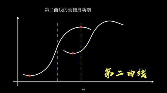 在第一曲线过了破局点,处在增长期,但增长加速度开始下降了,就是第一曲线到达财务极限点之前开启,如果过早开启就是低水平的重复,如果过晚,丧失潜在发展机会。