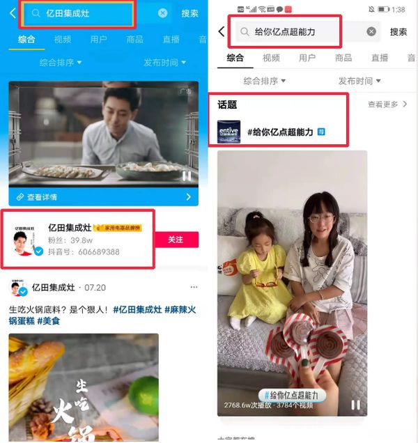 ①.打开抖音APP搜索“亿田集成灶”或“给你亿点超能力”,点击进入专题页面。