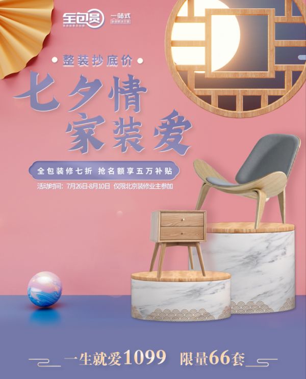 七夕活动期间,66套限量装开抢,数量有限,且仅限北京地区装修业主参与,1099元/㎡价格(此价格不含税金及管理费)即可实现家居设计、品质、施工、保障“四项升级”,花最少的钱,装最好的家。