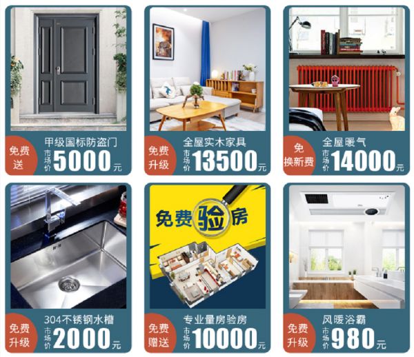 第二重“六免”,市场价5000元的甲级国标防盗门免费送;免费升级市场价13500元的全屋实木家具;市场价14000元的全屋暖气免费换新;免费升级市场价2000元的304不锈钢水槽;免费赠送市场价10000元的专业量房验房服务;免费升级市场价980元的风暖浴霸。完美提升家装品质,享有百分百的收获感。