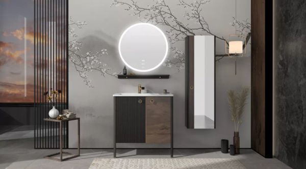 半月系列浴室柜将中式风格与现代元素相融合,不对称的门板分割,打破了中式家具原有的对称美学,保留的是中式气质高雅的胡桃木纹,拉手是作品的点睛之笔,半镂空半镶嵌的中式传统工艺,搭配现代极简的外观形式,金色拉手精巧雅致,折射出一款独特韵味的中高档新中式家具,一种中国古典美学的典范。