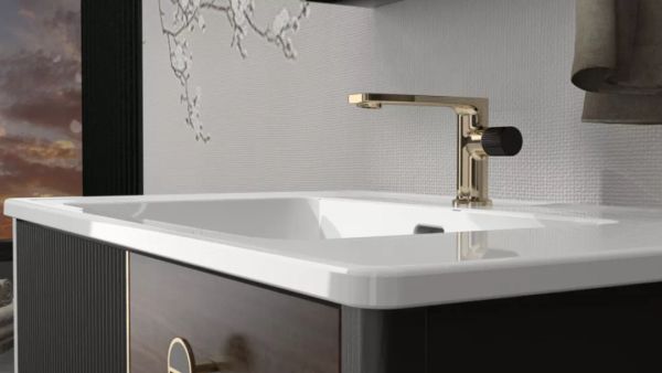 在面盆龙头处理上,搭配黑金配色的设计,优雅与永恒的设计理念贯穿产品,以几何元素为基本形式,造型极简美观。旋钮采用有触感的肌理防滑设计,具备传统的力学设计,旋转手感顺滑,舒适好用。正面造型圆润柔和优雅,背面造型提取硬朗方正的建筑风格,刚柔并济。