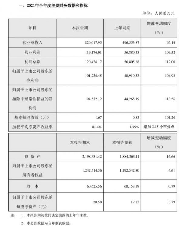 8月11日,欧派家居发布半年度业绩快报,报告期内,公司2021年半年度营业收入为82.00亿元,同比增长65.14%;归母净利润10.12亿元,同比增长106.98%;实现总资产219.83亿元,较本报告期初增长16.66%;实现归属于上市公司股东的所有者权益124.75亿元,较本报告期初增长4.61%。