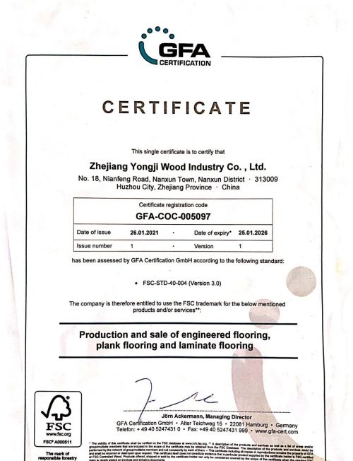 永吉地板获“FSC泛欧森林认证、欧盟CE认证”