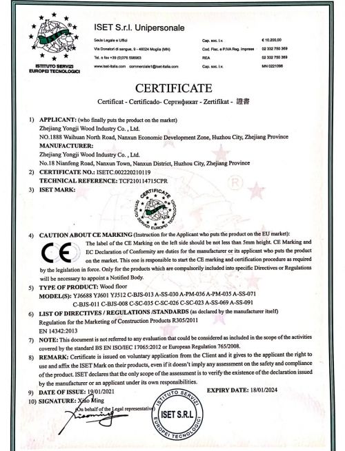 永吉地板通过了安全、环保、卫生等各项指标测定,获得欧盟认证机构颁发的CE认证证书,具备CE认证,标志着永吉地板符合欧盟产品标准可将产品销往欧洲市场,产品安全值得信赖,也是对永吉产品质量的一种认可。