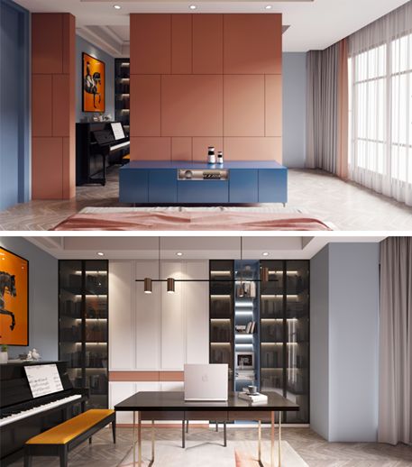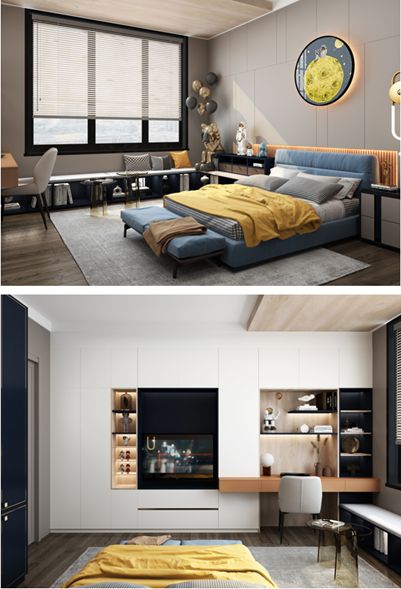 2021柏厨新品“未央”通过对孩子生活形态的分析,提炼出“梦想的栖息站”主题,在质感上从孩子的身体外形、体格、活动能力、智力和认知能力的发展特征去选择材料或者是配色,设计出满足使用功能、安全与健康、趣味与益智、舒适与易用、时尚与新颖以及可成长性的家居。符合人体工学的学习桌,可满足孩子绘图、绘画、设计及学习等功能需求,可自动端正学生坐姿,预防近视和脊椎病。朝阳透过窗户,孩子朝气蓬勃的和同学开启美好的一天;夕阳透过窗纱,孩子收起书本,与朋友们一起谈天说地。