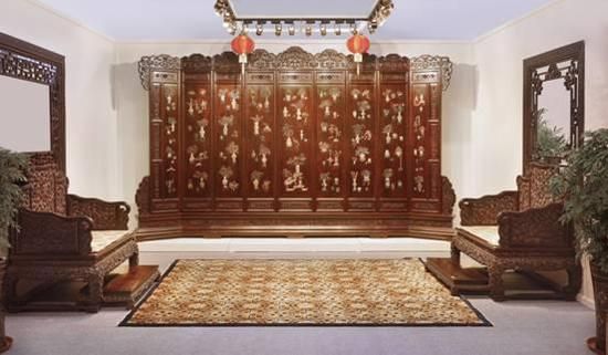 地座屏”,采用野生印度檀香紫檀老料精制而成屏体共由九扇围屏组成,高达255公分,围长430公分,进深56公分,如此体量的屏风类家具极为少见。首尾两扇斜向外展,中间七扇纵贯一气;全屏气象恢宏,巍然肃穆。其用材极尽奢华(奢华装修效果图),加上出神入化的雕刻技艺,将皇家宫廷的豪华富贵气象烘托得淋漓尽致。屏帽锼成如意云形,其上浮雕草叶花纹,雕工精微,布局合理。每扇屏心采用百宝嵌工艺,均以各色翡翠、玉石为饰,镶嵌出各种鲜花异卉、文玩博古,其色五彩斑斓,其韵生动雅致。此屏秉承清代宫廷家具之精髓而又别开生面,恢宏大气而又极尽工艺之美,实为借古开今的精品重器。