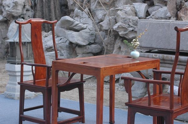 研讨会之后,活动进入风雅再现部分。一众嘉宾移步到静怡轩庭院。此时的建福宫、丽日蓝天、青瓦红墙、白桥灰阶、苍松翠柏、鸦鹊嬉戏,如一幅幅秀美图卷,令人心生敬畏却又心驰神往。而在庭院的各处,则陈设着本次伍炳亮先生参展的各款海南黄花梨系列臻品。包括有四出头官帽椅、圈椅、五足圆几、天香几、琴几、棋桌、画案等。这些作品均为造型简炼、拿捏老辣、曲直、方圆、粗细、大小比例恰当的明式文人家具精品,每一件通过黄花梨的秀美纹理予以雕饰,并得大道至简之境。即使置身于雄壮、厚重、庄严、肃穆的皇家庭院,作品依然体现着极高的融合度,可用、可赏、可藏。内在流淌的是中国千年传承的文脉,其旺盛的生命力历经时空变换,源远流长,从古至今,一脉相承。值得一提的是,本次展出的作品大都为海南黄花梨“一木一器”手法所制,且均为全榫卯结构可拆装家具,没用一颗钉子,也无一处胶粘,完全靠榫卯结合,既严丝合缝,但各个构件又完全可以进行手工拆卸、拼接而不影响家具本身的稳固,将中国古典家具尊重材料、崇尚自然的传统发挥到了极致。在资源枯竭的今天,海南黄花梨家具很难有系列再制的可能,“一木一器”更将成为绝响,因此仅就材质而言,本次展览便已经弥足珍贵。