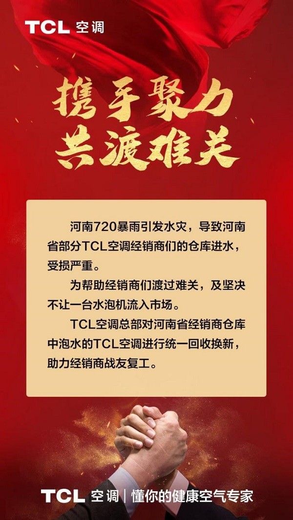 作为多年坚实的合作伙伴,TCL空调总部自河南洪灾之初,便一直心系着河南经销商战友。在了解到经销商们因灾情受损严重的情况后,TCL空调火速开展帮助河南经销商渡过难关、快速复工的专项会议,讨论研究相应的政策,决定对河南省经销商仓库入水而导致水泡的TCL空调统一回收换新,减少经销商损失,携手聚力渡过难关。与此同时,本着对用户负责的一贯做法,通过统一对因受灾泡水的空调回收换新,坚决不让一台“水泡机”流入市场,从源头上消除因受灾泡水的空调可能存在的安全隐患,让消费者在灾后亦能放心购买TCL空调任意一款产品。