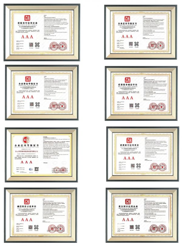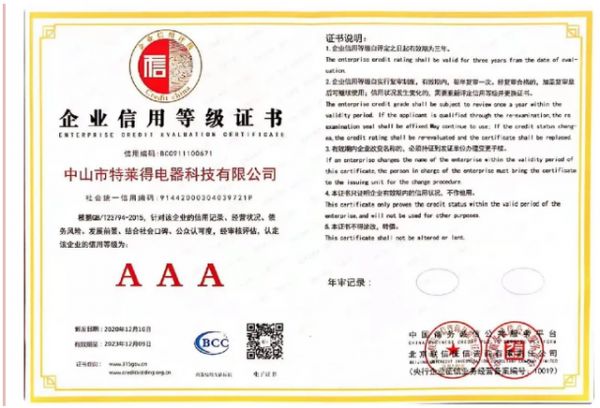 热烈庆贺中山市特莱得电器科技有限公司被授予3A信用等级证书以及重合同守信用3A 企业等荣誉称号。