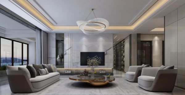 【户型阐述】:本案原户型为305㎡的三室,由于客户购买了同一层的两套大平层,设计师陶凌根据顾客的需求,把610㎡的空间打通,经过合理设计,做出以下分配:一个主卧+一个父母房+两个小孩房+一个保姆房+一个客房的豪宅配置,外加面积为67㎡的全景阳台。户型功能齐备、空间尺度较大。