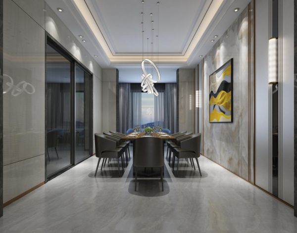 餐厅:餐厅采用吊灯设计,使得整个空间更加丰富温馨。整个空间的色彩也是白、灰为主,背景墙上选择的是色彩比较丰富的画,做了视觉上的跳跃,更让人感到空间的通透与舒适自由。