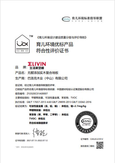 该产品通过【育儿环境优标(CAS.UX)】认可,表明该产品在健康环保指标和安全性能上均有符合适儿空间、儿童友好需求的突出表现。