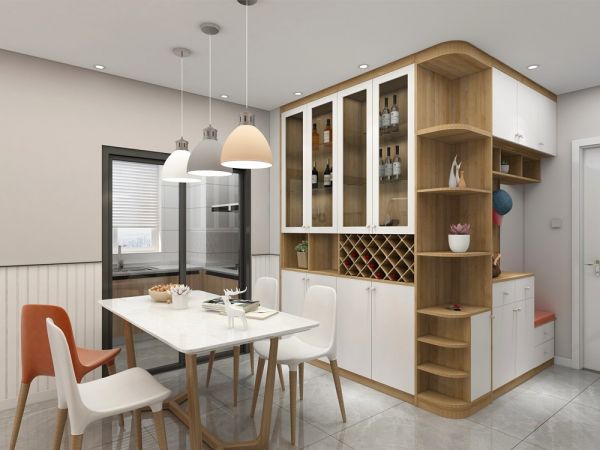 题主说还想在玄关做个酒柜,看描述题主应该是想在这里做个餐边柜。看了题主的户型图,YOYO建议是可以在靠右的那面墙做个半墙或者是整墙的餐边柜,设计上可以采用半开放式的,将酒格、储物柜、酒杯架融为一体,不仅能展示,还能收纳,最大限度利用起墙面空间。