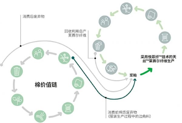而兰精集团,每天都赋予废料以新的生命。兰精集团运用悦菲纤™技术 和“ Eco Cycle生态循环”等开创性技术,把对环境负责的莱赛尔纤维生产与棉花废料的升级再造相结合,为循环经济做出贡献。