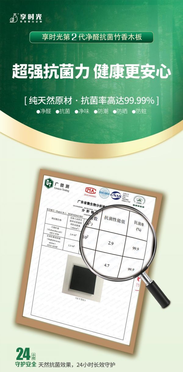 享时光新一代净醛抗菌竹香木,从源头上实现零醛添加,不仅具有超强吸附力,还具有防潮防晒防蛀等优越性能,将净醛、抗菌、净味、防蛀、防晒、防潮等居家问题考虑得面面俱到,旨在为每个家庭健康的阳台生活保驾护航,不断提升全民家庭的健康幸福指数!