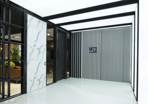 白色底板上,黑色格栅线条顺序排列,简单直白,由宽至窄,大面积铺陈演绎着条纹的经典魅力。门则隐于墙中,不打断线条的延伸舒展。极致的色彩对比配以律动的线条,在黑与白,宽与窄的戏剧性冲突中,玩味活力扑面而来。
